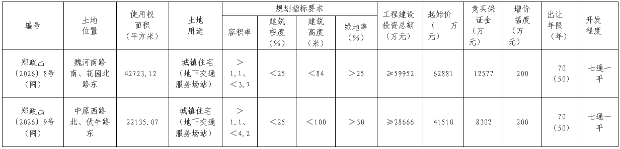 郑政出〔2026〕9号(网)地块位于中原西路北、伏牛路东,使用权面积22135.07平方米(约33.2亩),为城镇住宅用地,要求建筑高度不超过100米,起始价41510万元。