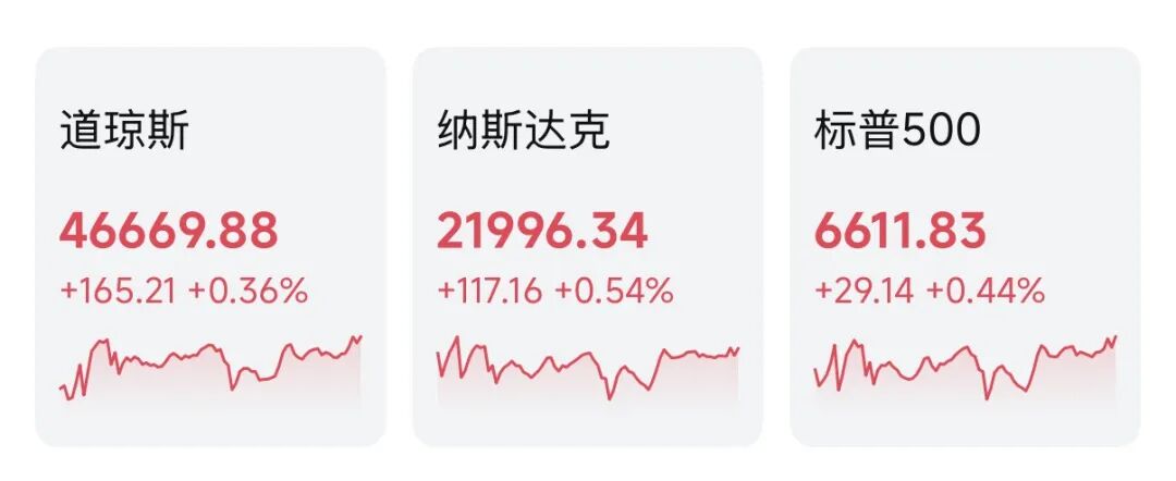 截至收盘,道指涨0.36%,报46669.88点;纳指涨0.54%,报21996.34点;标普500指数涨0.44%,报6611.83点。