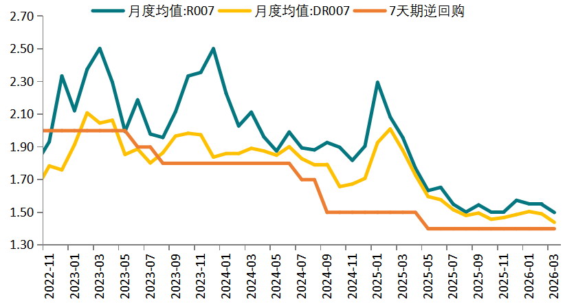 从3月债市交易主线来看,政策基调未超预期,对市场的影响有限,但中东地缘冲突持续升级,债市交易逻辑为“避险”与“通胀担忧”交织。尤其是在油价上行带来产业链价格上涨传导作用下,“通胀担忧”导致债市一度快速下跌,之后随着特朗普释放谈判信号,“通胀担忧”有所缓和,市场担忧逐渐由“胀”转向“滞”,支撑债市情绪持续修复。总体看,3月债市呈现震荡走势,长端国债收益率小幅上行,受同业存款自律升级预期、资金面平衡偏宽松的支撑,中短端债券市场表现较好。国债收益率曲线呈现陡峭化趋势。