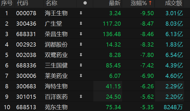 创新药概念股走低 海王生物触及跌停