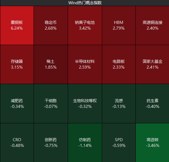 覆铜板、存储器、高速铜连接、钠离子电池、电路板、先进封装、化工、电子元器件等概念涨幅居前;能源设备、石油天然气、制药、农业、煤炭、贵金属等概念跌幅居前。