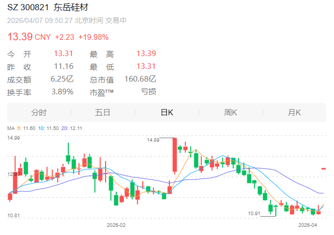 东岳硅材开盘19.98%涨停,4月3日晚间,东岳硅材发布公告称,预计2026年一季度归属于上市公司股东的净利润盈利1.83亿元~2.03亿元,同比增长397.02%~451.34%。自2025年12月份以来,受市场环境及行业供需格局改善影响,有机硅行业主要产品价格上涨并回归合理区间,公司产品毛利率显著提升。