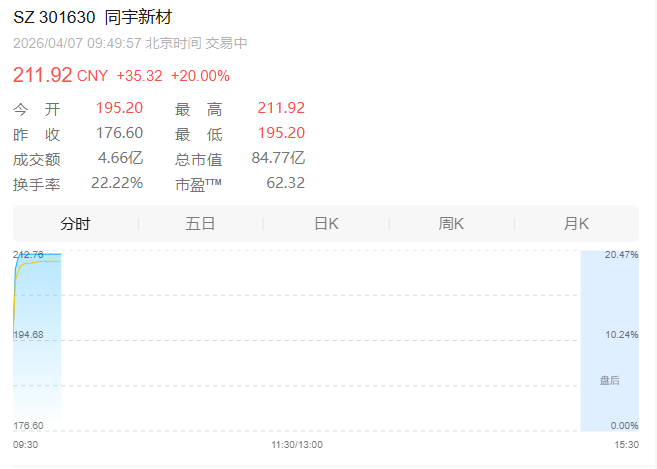 覆铜板概念中,同宇新材开盘一字涨停,涨幅20%。公开信息显示,公司是中高端覆铜板行业电子树脂供应商,通过服务覆铜板行业客户,公司产品最终主要应用于计算机、消费电子、汽车电子、通讯等领域。