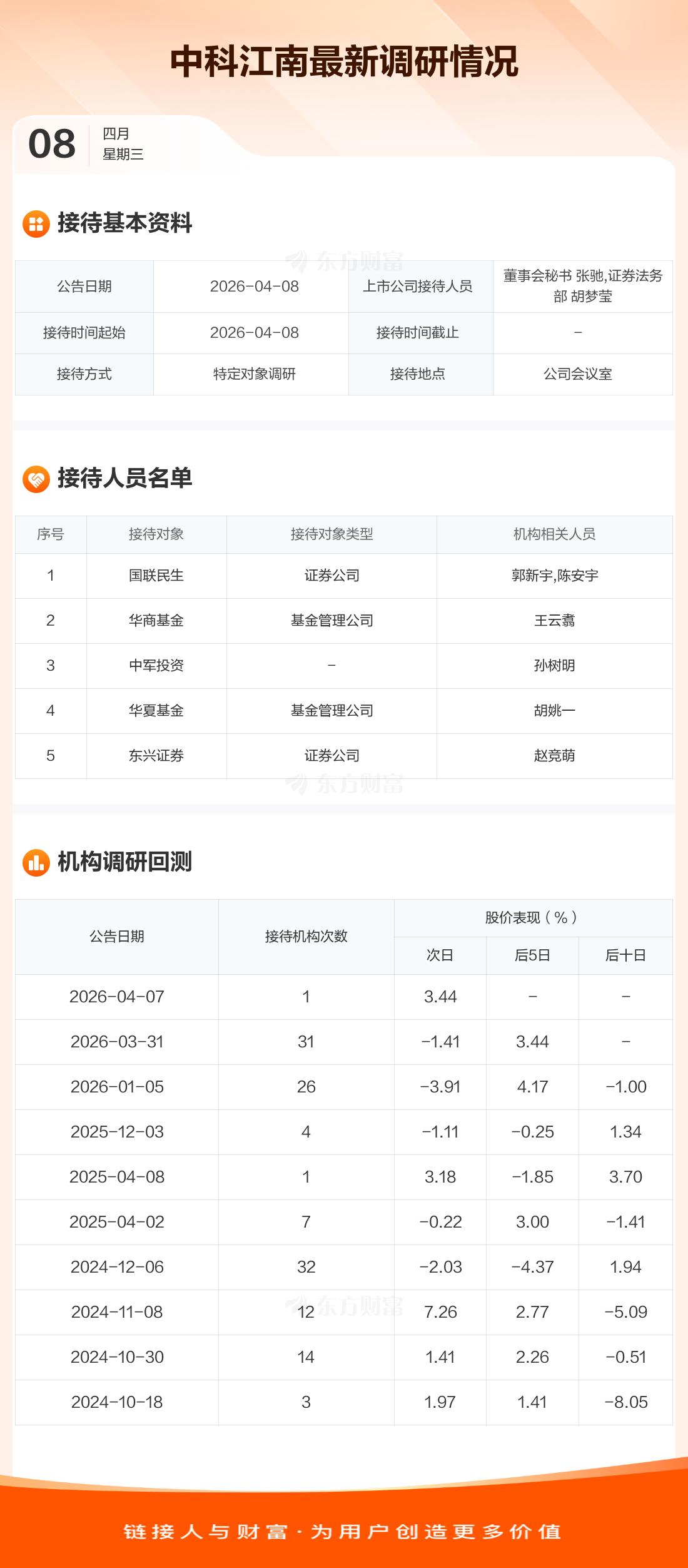 中科江南4月8日公告称,4月8日接待国联民生等5家机构调研。接待人员包括董事会秘书 张驰,证券法务部 胡梦莹。