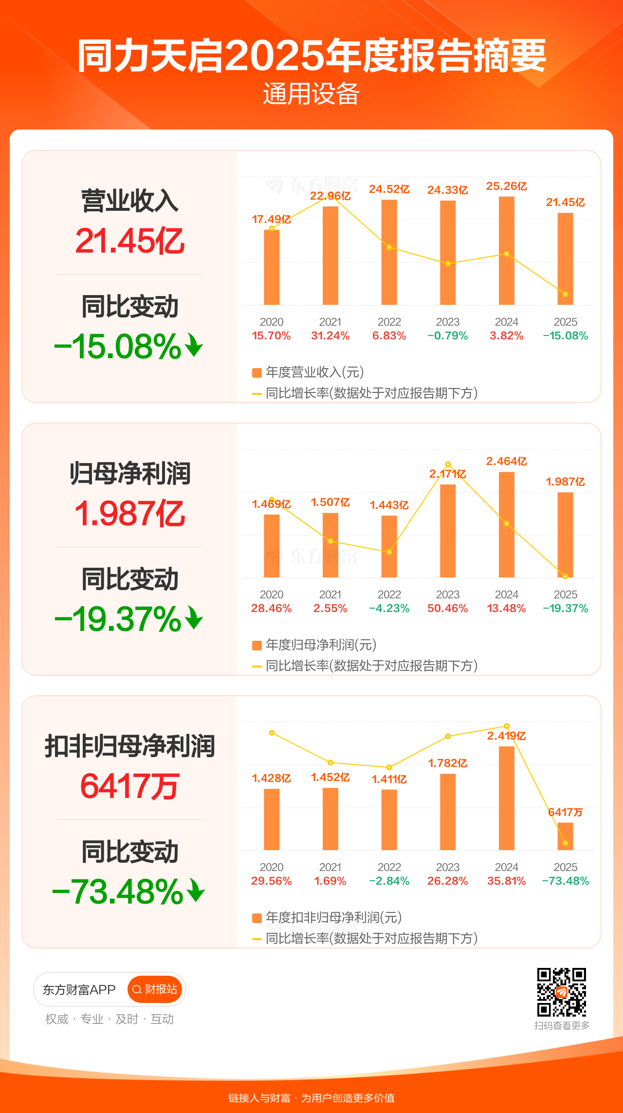 同力天启4月9日发布2025年年报显示,公司全年实现营业收入21.45亿元,同比下滑15.08%;归母净利润1.99亿元,同比下滑19.37%;扣非归母净利润6417.09万元,同比下滑73.48%。