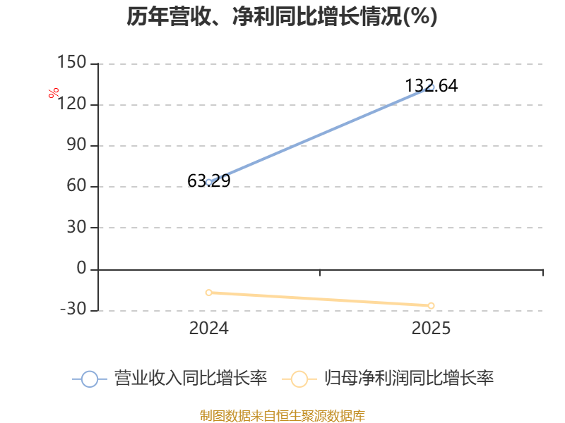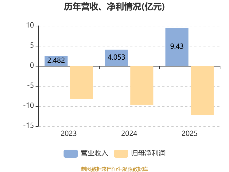 财务数据显示,2023年至2025年公司营收分别为2.48亿元、4.05亿元、9.43亿元,2025年同比增长132.8%。同期公司仍处于亏损阶段,主要受研发投入、产能建设及前期定价策略影响,2025年研发费用3.77亿元,占营收比重达40.0%。