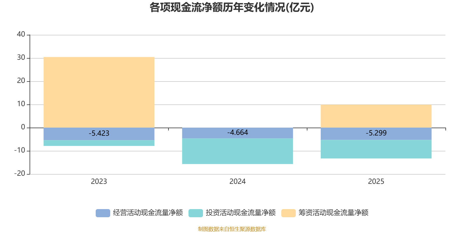 2025年,公司经营活动现金流净额为-5.3亿元,同比减少6349.9万元;筹资活动现金流净额9.88亿元,同比增加9.85亿元;投资活动现金流净额-8.01亿元,上年同期为-11.05亿元。