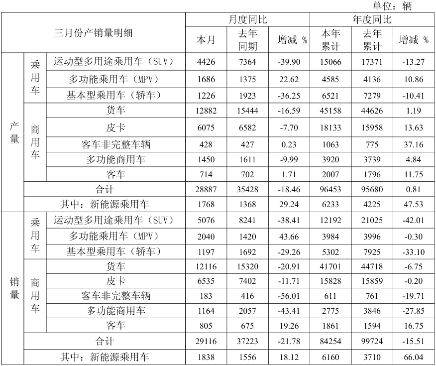 江淮汽车:3月产销双降 SUV销量下降38.41%