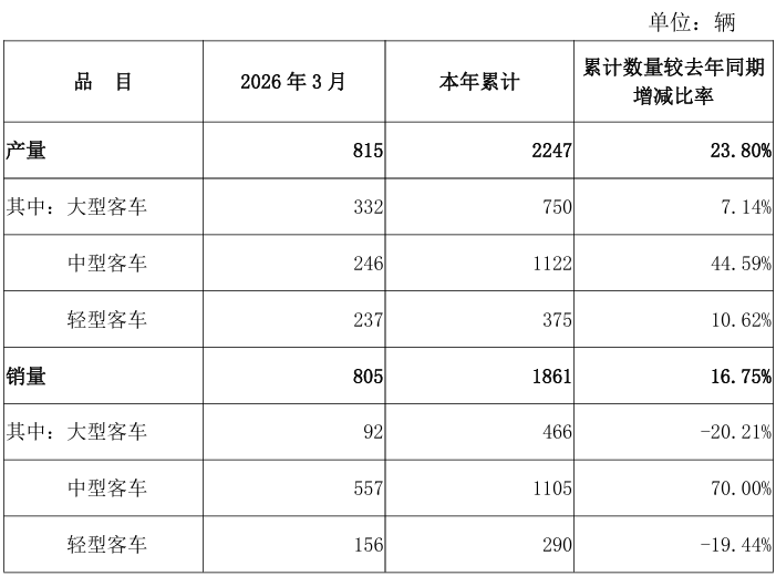 安凯客车:一季度累计销量1861辆 同比增长16.75%