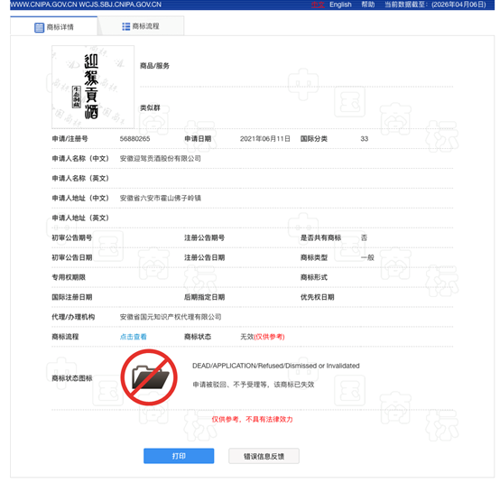 蓝鲸新闻记者查询国家知识产权局商标局信息注意到,迎驾贡酒生态洞藏商标显示申请被驳回,不予受理等,该商标已失效。