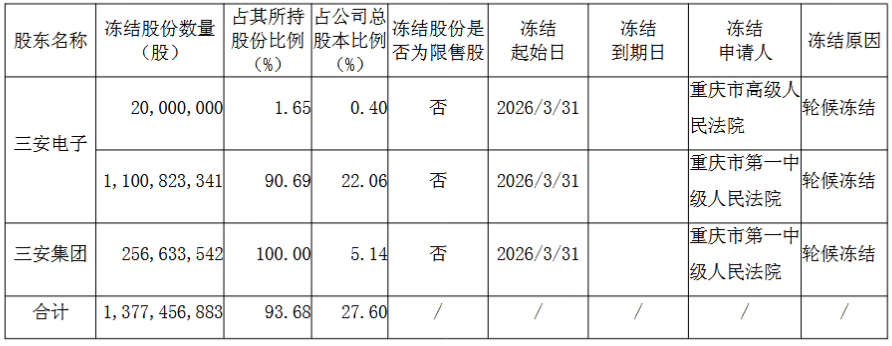截至公告披露日,三安电子和三安集团累计被司法冻结14.7亿股,占其所持股份的100%及公司总股本的29.47%。