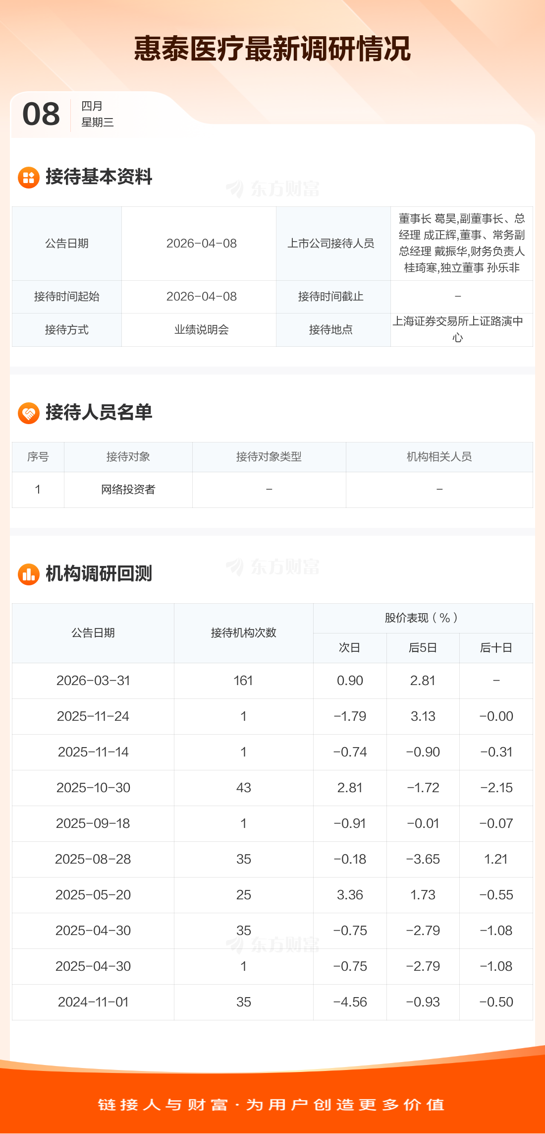 惠泰医疗4月8日公告称,4月8日接待网络投资者等1家机构调研。接待人员包括董事长 葛昊,副董事长、总经理 成正辉,董事、常务副总经理 戴振华,财务负责人 桂琦寒,独立董事 孙乐非。