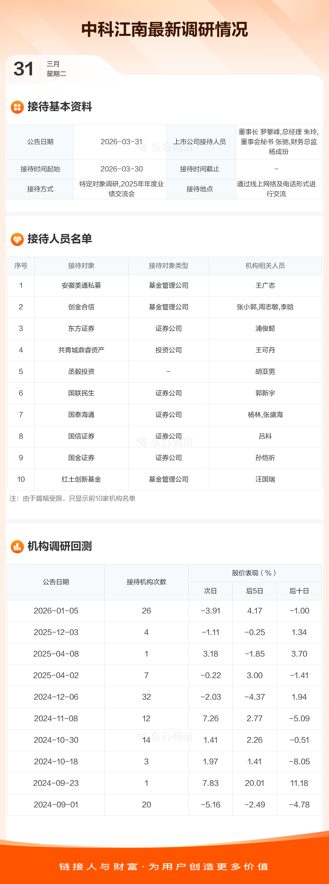 中科江南3月31日公告称,3月30日接待安徽美通私募等31家机构调研。接待人员包括董事长 罗攀峰,总经理 朱玲,董事会秘书 张驰,财务总监 杨成玢。