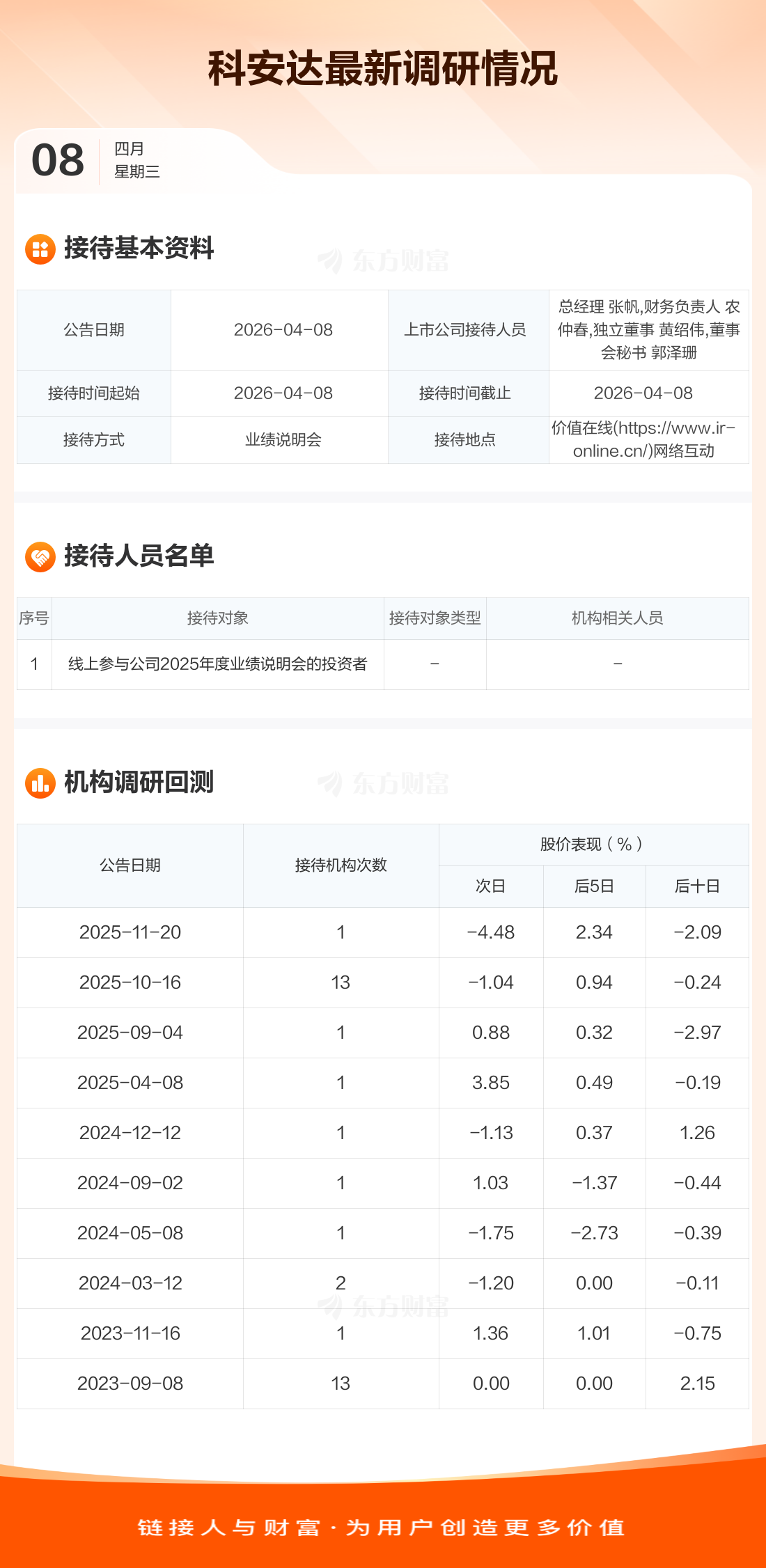 科安达4月8日公告称,4月8日接待线上参与公司2025年度业绩说明会的投资者等1家机构调研。接待人员包括总经理 张帆,财务负责人 农仲春,独立董事 黄绍伟,董事会秘书 郭泽珊。