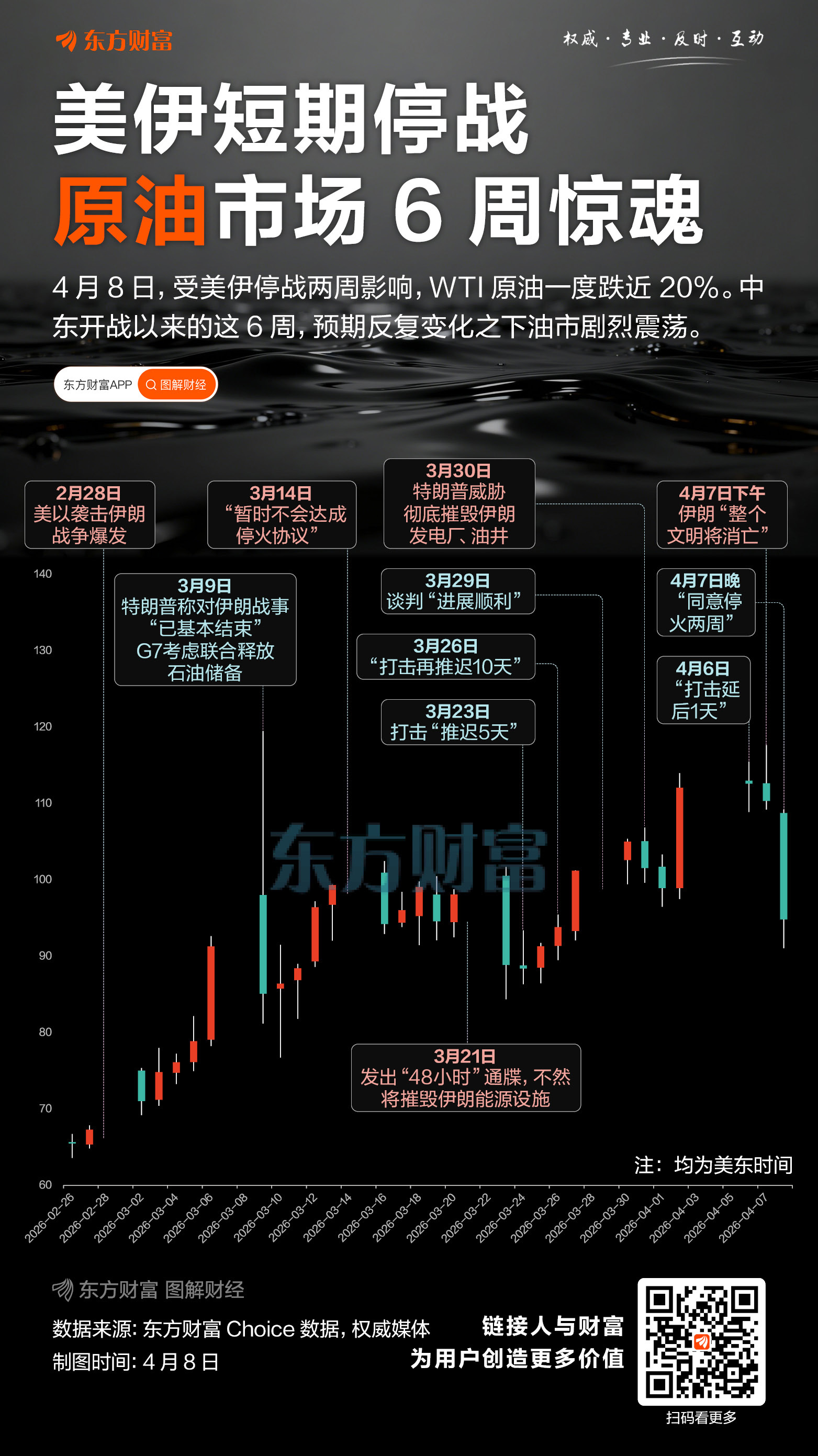 进入4月,特朗普的TACO套路再度升级。当地时间4月4日,他再次发出“48小时最后通牒”要求伊朗投降,6日主动延长期限,7日更是发出“12小时内不达成协议便摧毁文明”的末日警告,可就在距其设定的最后期限仅剩88分钟时,他突然宣布接受巴基斯坦的调解方案,同意与伊朗达成两周的停火协议,从极致威胁到骤然妥协,短短三天内数次变脸,国际油价随之巨震。