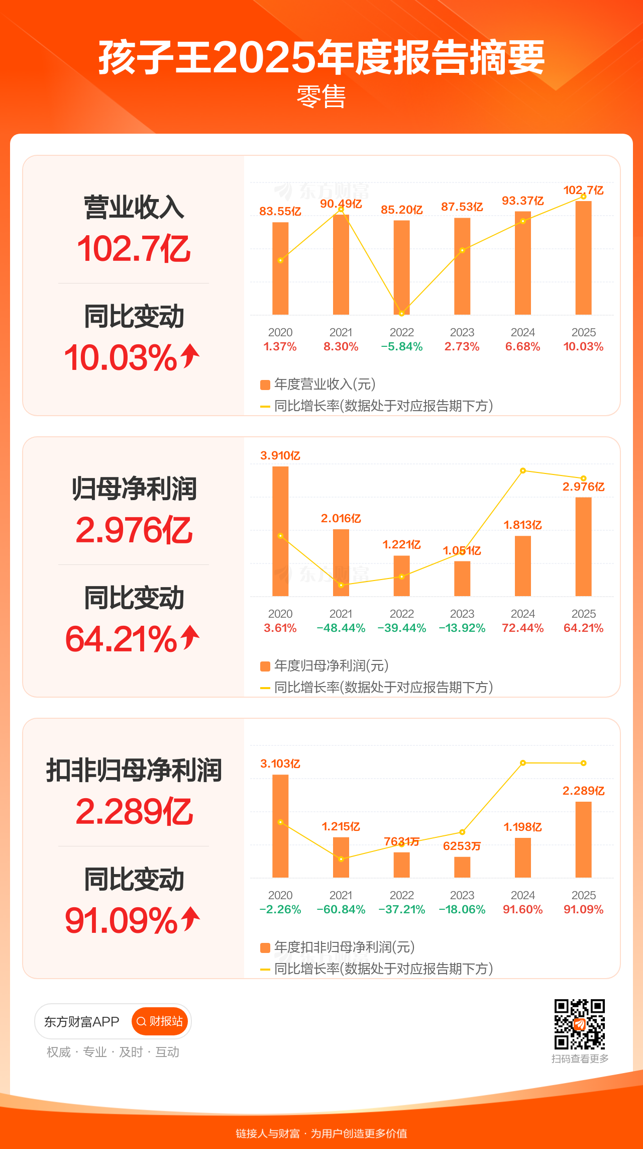 孩子王4月9日发布2025年年报显示,公司全年实现营业收入102.73亿元,同比增长10.03%;归母净利润2.98亿元,同比增长64.21%;扣非归母净利润2.29亿元,同比增长91.09%。