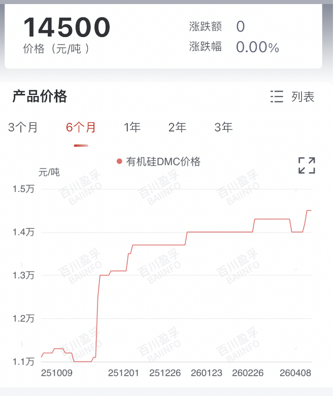 据行业数据,2025年10月有机硅DMC价格仅1.13万元/吨,处于亏损线附近;今年3月行业减产力度加大至35%后,价格加速上涨,截至目前,有机硅DMC主流报价已接近1.5万元/吨,较2025年底底部涨幅超30%。
