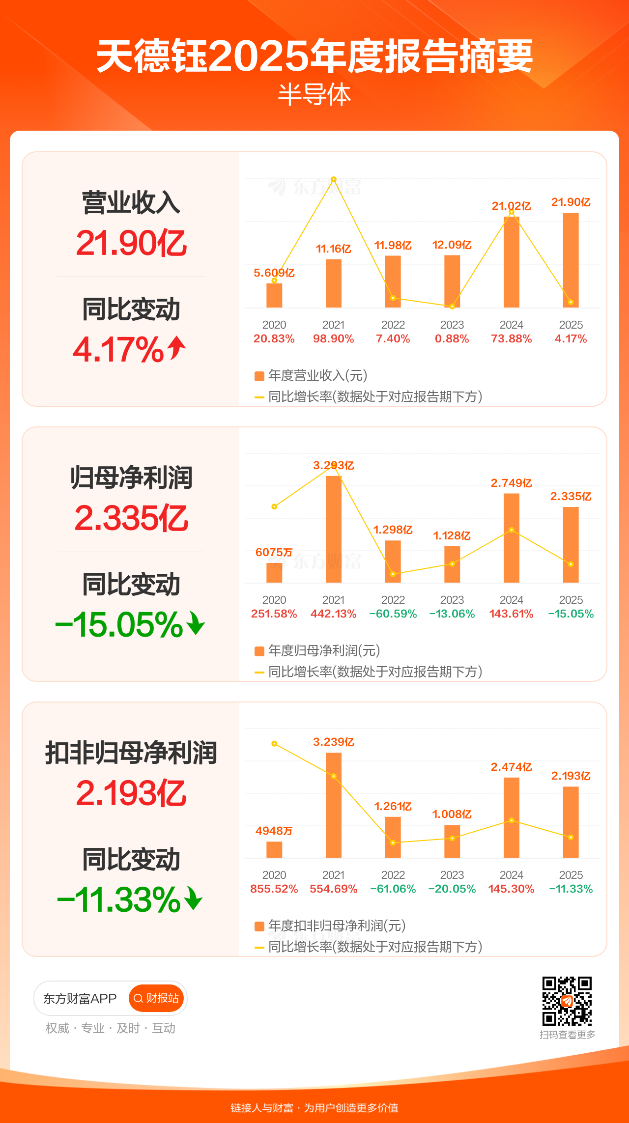 天德钰4月9日发布2025年年报显示,公司全年实现营业收入21.90亿元,同比增长4.17%;归母净利润2.34亿元,同比下滑15.05%;扣非归母净利润2.19亿元,同比下滑11.33%。