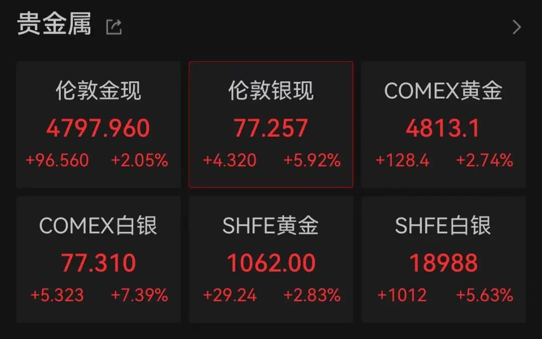 贵金属市场走强。北京时间19:56,伦敦现货黄金涨2.05%,伦敦现货白银大涨5.92%;COMEX黄金期货上涨2.74%,COMEX白银期货大涨7.39%。