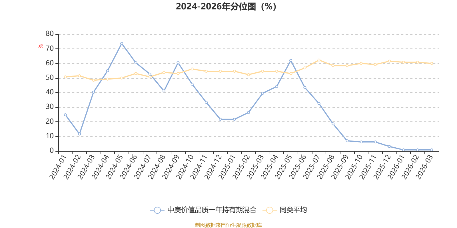 通过所选区间该基金净值增长率分位图,可以观察该基金与同类基金业绩比较情况。图为坐标原点到区间内某时点的净值增长率在同类基金中的分位数。