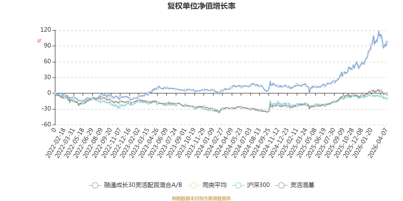 截至4月7日,融通成长30灵活配置混合A/B近三个月复权单位净值增长率为10.22%,位于同类可比基金41/1287;近半年复权单位净值增长率为35.90%,位于同类可比基金7/1286;近一年复权单位净值增长率为96.87%,位于同类可比基金60/1286;近三年复权单位净值增长率为83.33%,位于同类可比基金42/1286。