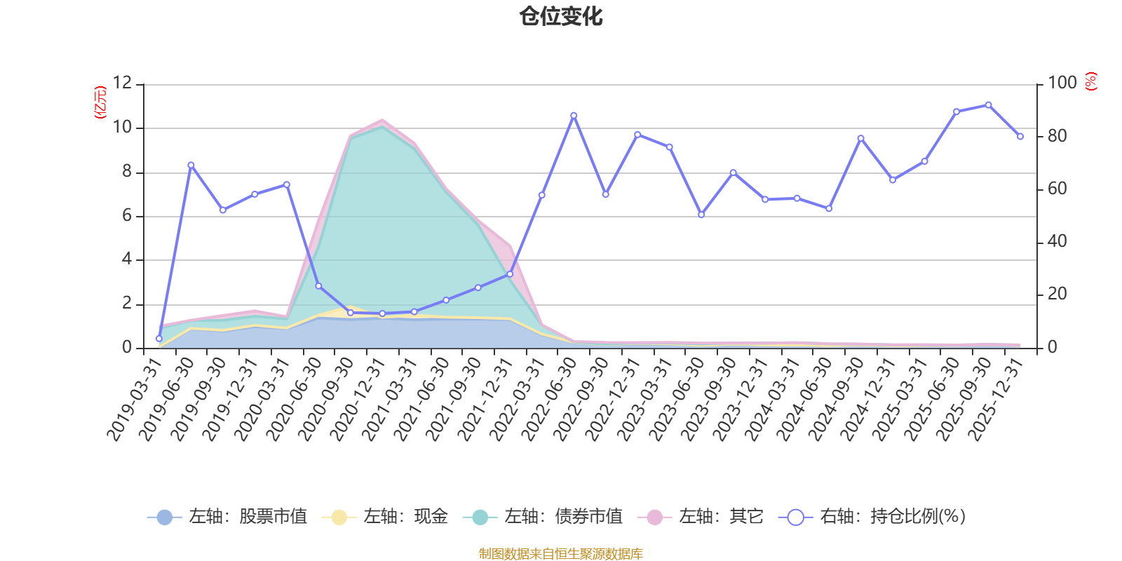 据定期报告数据统计,近三年平均股票仓位为69.6%,同类平均为72.57%。2025年三季度末基金达到92.13%的最高仓位,2019年一季度末最低,为3.64%。
