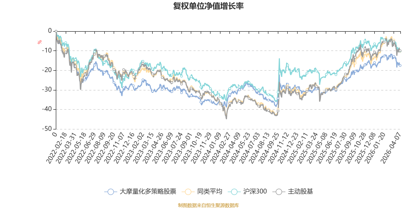 截至4月7日,大摩量化多策略股票近三个月复权单位净值增长率为-4.66%,位于同类可比基金74/121;近半年复权单位净值增长率为1.07%,位于同类可比基金68/121;近一年复权单位净值增长率为25.79%,位于同类可比基金78/120;近三年复权单位净值增长率为17.16%,位于同类可比基金40/90。