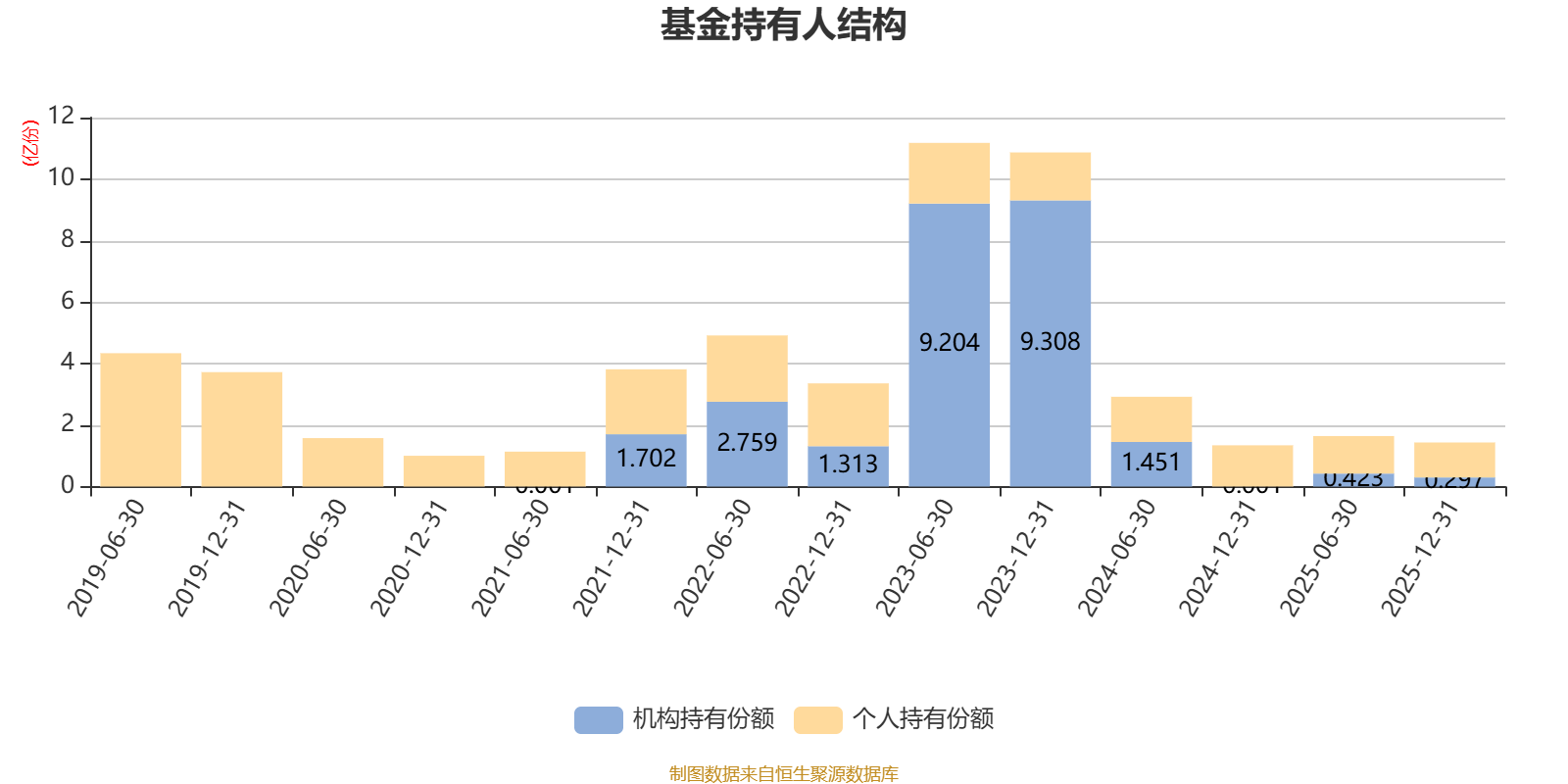 截至2025年12月31日,基金持有人共计1.15万户,合计持有1.43亿份。其中管理人员工持有14.41万份,占比0.10%,机构持有份额占比20.68%,个人投资者占比79.32%。