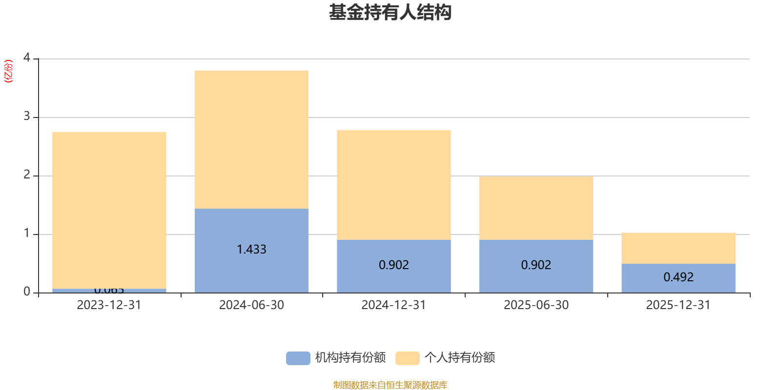 截至2025年12月31日,基金持有人共计1053户,合计持有1.02亿份。其中管理人员工持有235.86万份,占比2.31%,机构持有份额占比48.22%,个人投资者占比51.78%。