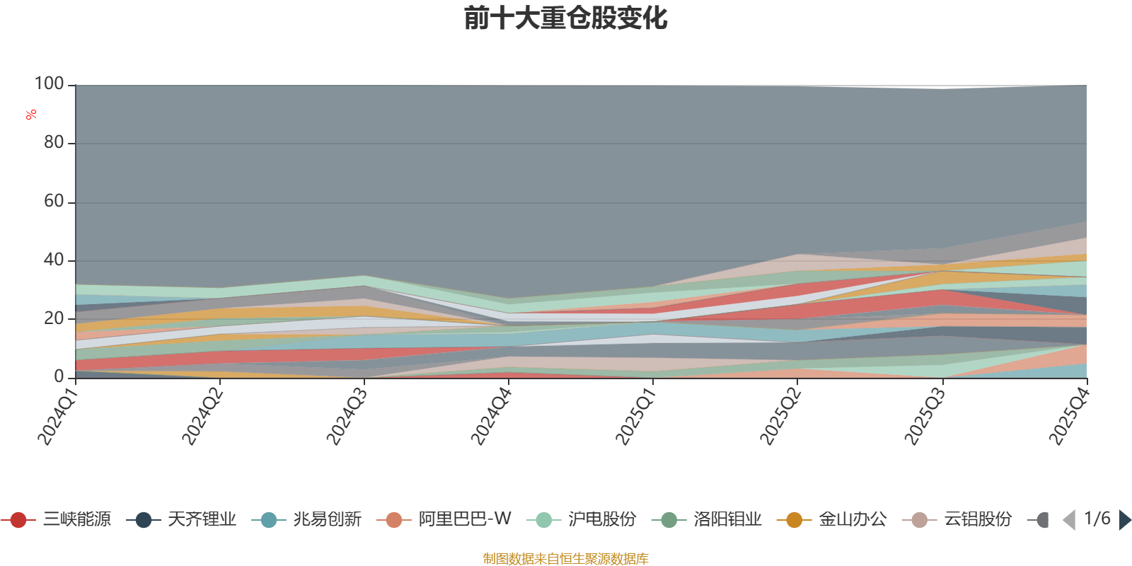 截至2025年末,基金重仓股分别是阿里巴巴-W、中钨高新、海光信息、北方华创、晶合集成、中芯国际、兆易创新、中稀有色、工业富联、华虹半导体、华虹公司。