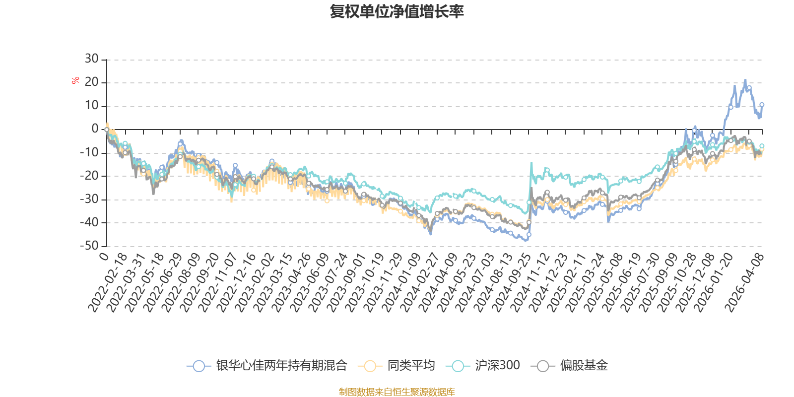 截至4月8日,银华心佳两年持有期混合近三个月复权单位净值增长率为6.33%,位于同类可比基金1/20;近半年复权单位净值增长率为14.13%,位于同类可比基金1/20;近一年复权单位净值增长率为81.82%,位于同类可比基金4/20;近三年复权单位净值增长率为42.21%,位于同类可比基金4/19。