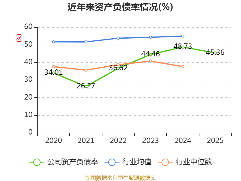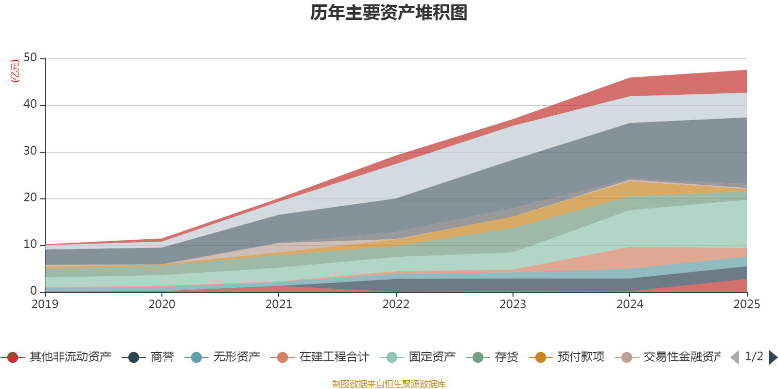 资产重大变化方面,截至2025年末,公司在建工程合计较上年末减少59.5%,占公司总资产比重下降6.19个百分点;预付款项较上年末减少84.39%,占公司总资产比重下降6.02个百分点;其他非流动资产较上年末增加2137.01%,占公司总资产比重上升5.47个百分点;固定资产较上年末增加30.81%,占公司总资产比重上升4.51个百分点。
