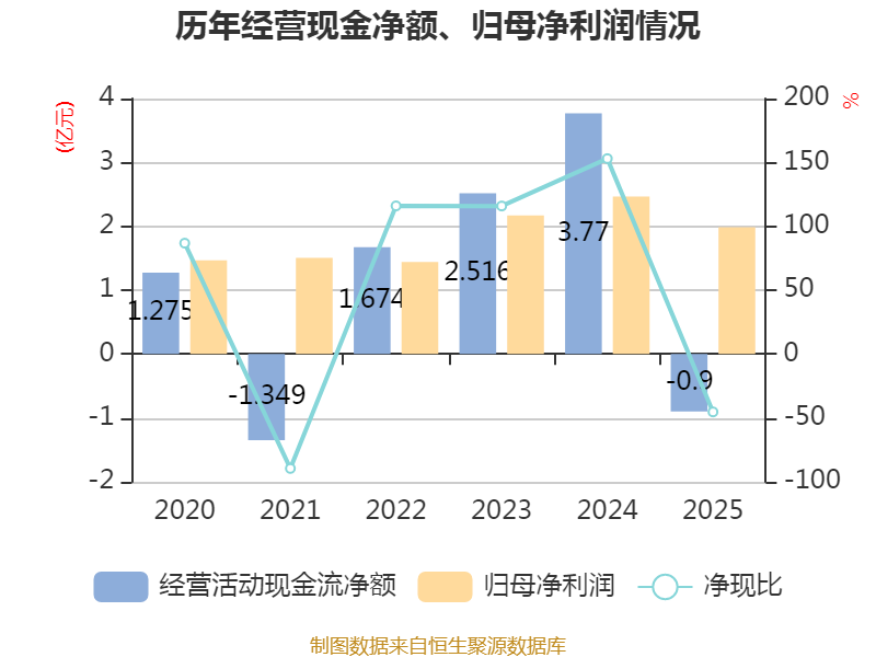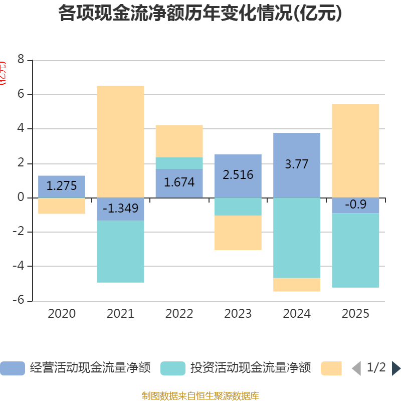 截至2025年,公司经营活动现金流净额为-9003.02万元,同比减少4.67亿元;筹资活动现金流净额5.47亿元,同比增加6.25亿元;投资活动现金流净额-4.34亿元,上年同期为-4.68亿元。
