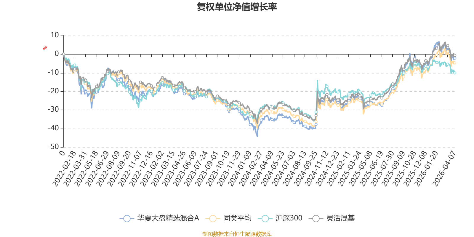 截至4月7日,华夏大盘精选混合A近三个月复权单位净值增长率为-4.10%,位于同类可比基金505/897;近半年复权单位净值增长率为-0.75%,位于同类可比基金512/896;近一年复权单位净值增长率为41.35%,位于同类可比基金353/896;近三年复权单位净值增长率为19.02%,位于同类可比基金344/895。