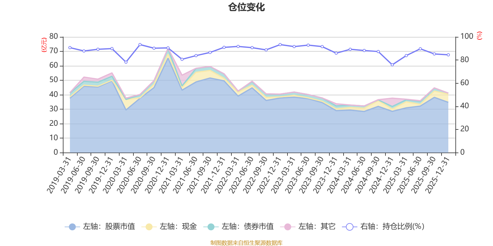 据定期报告数据统计,近三年平均股票仓位为87.19%,同类平均为81.24%。2020年上半年末基金达到93.36%的最高仓位,2024年末最低,为75.89%。