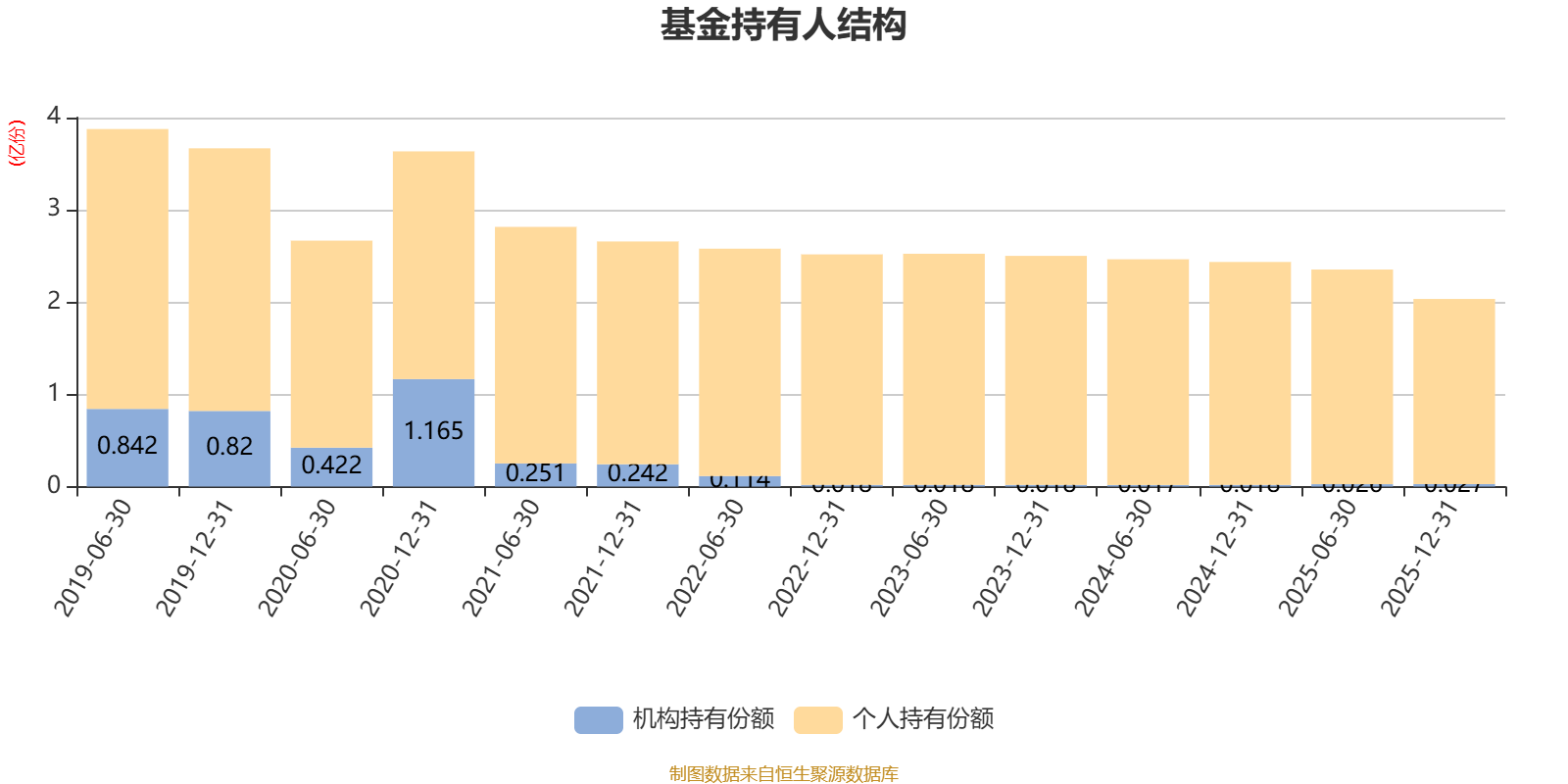 截至2025年12月31日,基金持有人共计9万户,合计持有2.03亿份。其中管理人员工持有5.61万份,占比0.03%,机构持有份额占比1.34%,个人投资者占比98.66%。