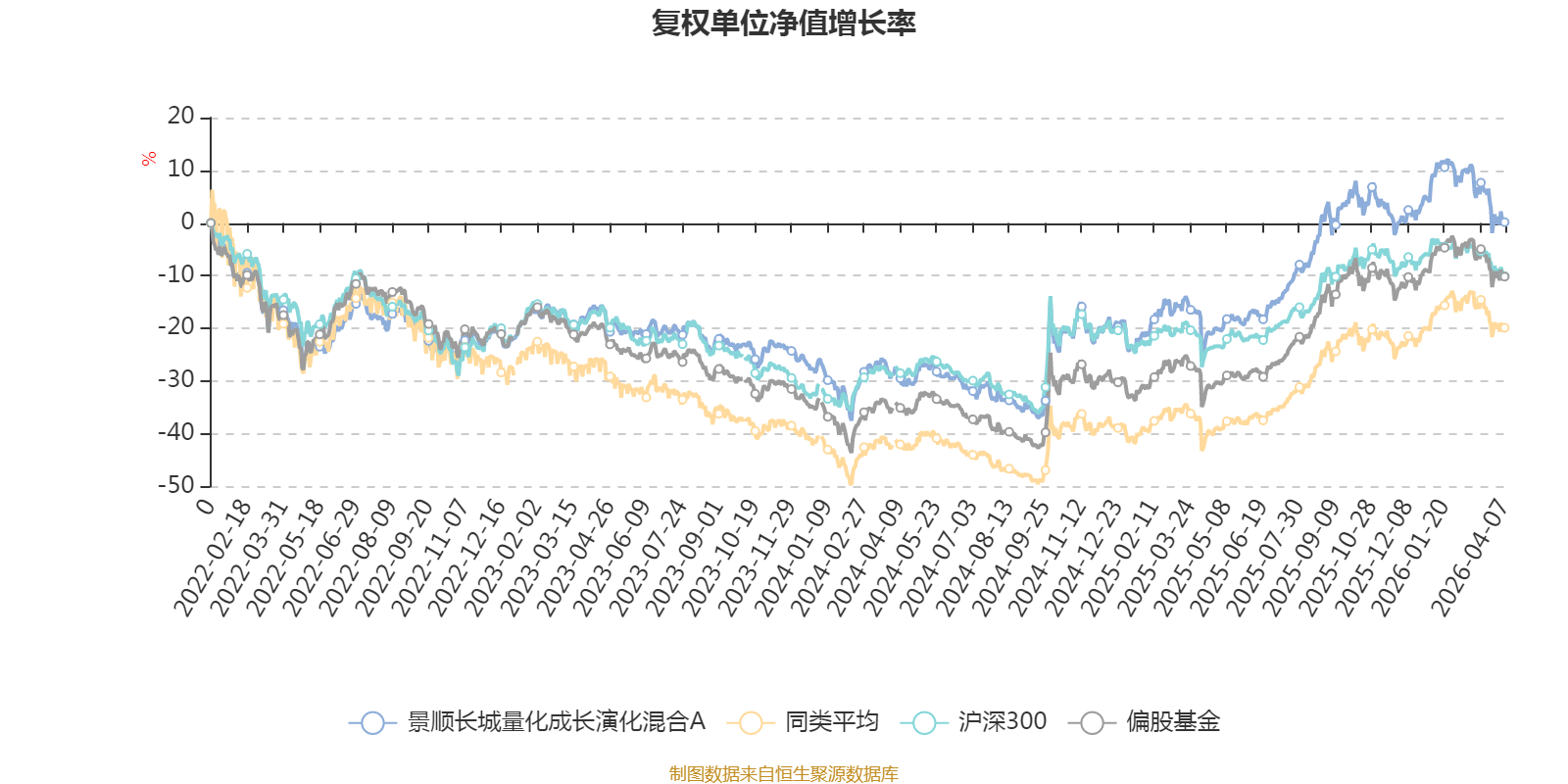 截至4月7日,景顺长城量化成长演化混合A近三个月复权单位净值增长率为-8.25%,位于同类可比基金477/621;近半年复权单位净值增长率为-6.19%,位于同类可比基金435/621;近一年复权单位净值增长率为33.51%,位于同类可比基金356/617;近三年复权单位净值增长率为18.67%,位于同类可比基金226/559。