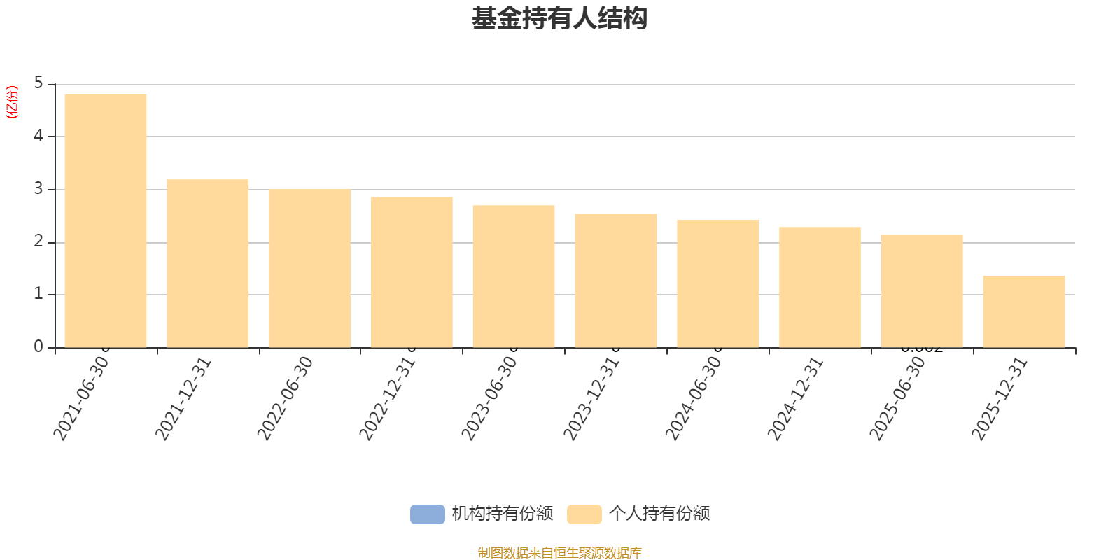 截至2025年12月31日,基金持有人共计6110户,合计持有1.36亿份。其中管理人员工持有2.81万份,占比0.02%,个人投资者占比100.00%。