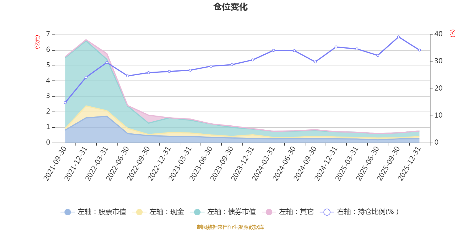 据定期报告数据统计,近三年平均股票仓位为32.36%,同类平均为19.2%。2025年三季度末基金达到39.12%的最高仓位,2021年三季度末最低,为14.81%。