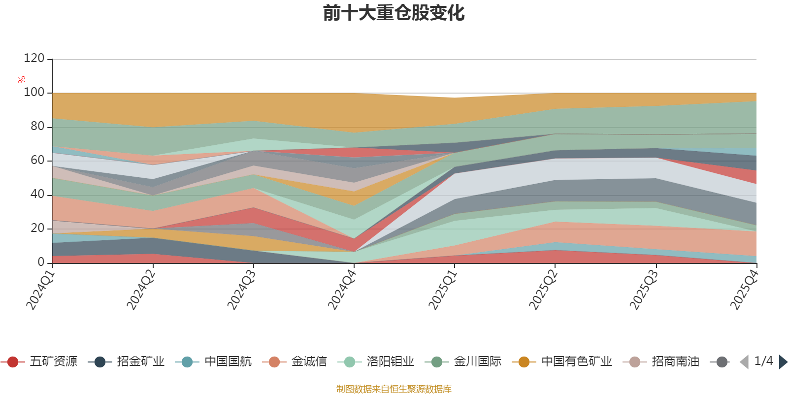 该基金持股集中度较高,近2年前十大重仓股集中度长期超过60%。截至2025年末,基金十大重仓股分别是紫金矿业、金诚信、株冶集团、湖南黄金、中矿资源、中国海洋石油、兖矿能源、中孚实业、中国国航、金川国际。
