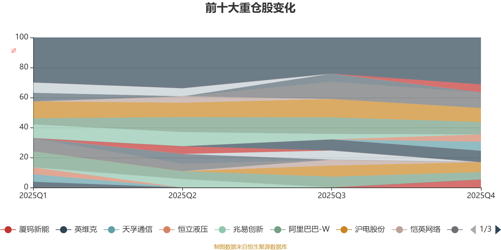 该基金持股集中度较高。截至2025年末,基金十大重仓股分别是中际旭创、腾讯控股、新易盛、工业富联、沪电股份、联赢激光、纳科诺尔、厦钨新能、阿里巴巴-W、中一科技。