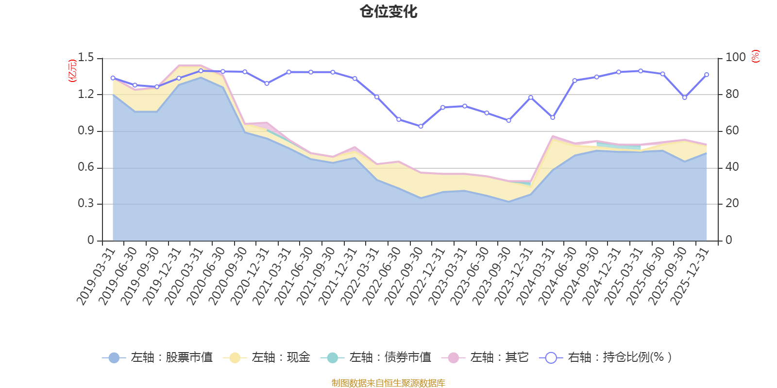 据定期报告数据统计,近三年平均股票仓位为81.63%,同类平均为72.57%。2020年一季度末基金达到93.11%的最高仓位,2022年三季度末最低,为62.72%。