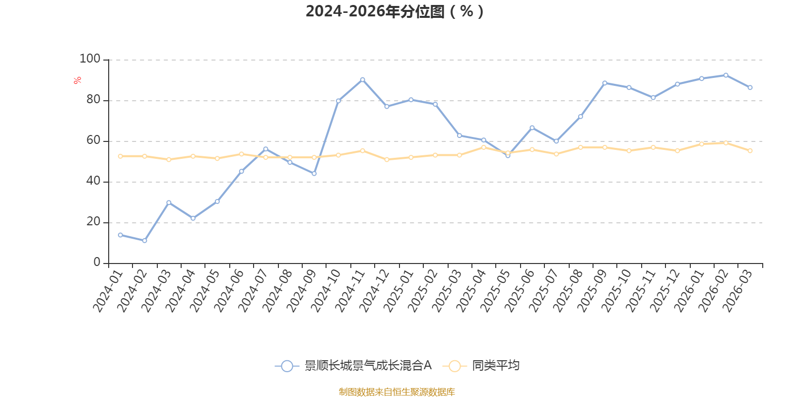 通过所选区间该基金净值增长率分位图,可以观察该基金与同类基金业绩比较情况。图为坐标原点到区间内某时点的净值增长率在同类基金中的分位数。