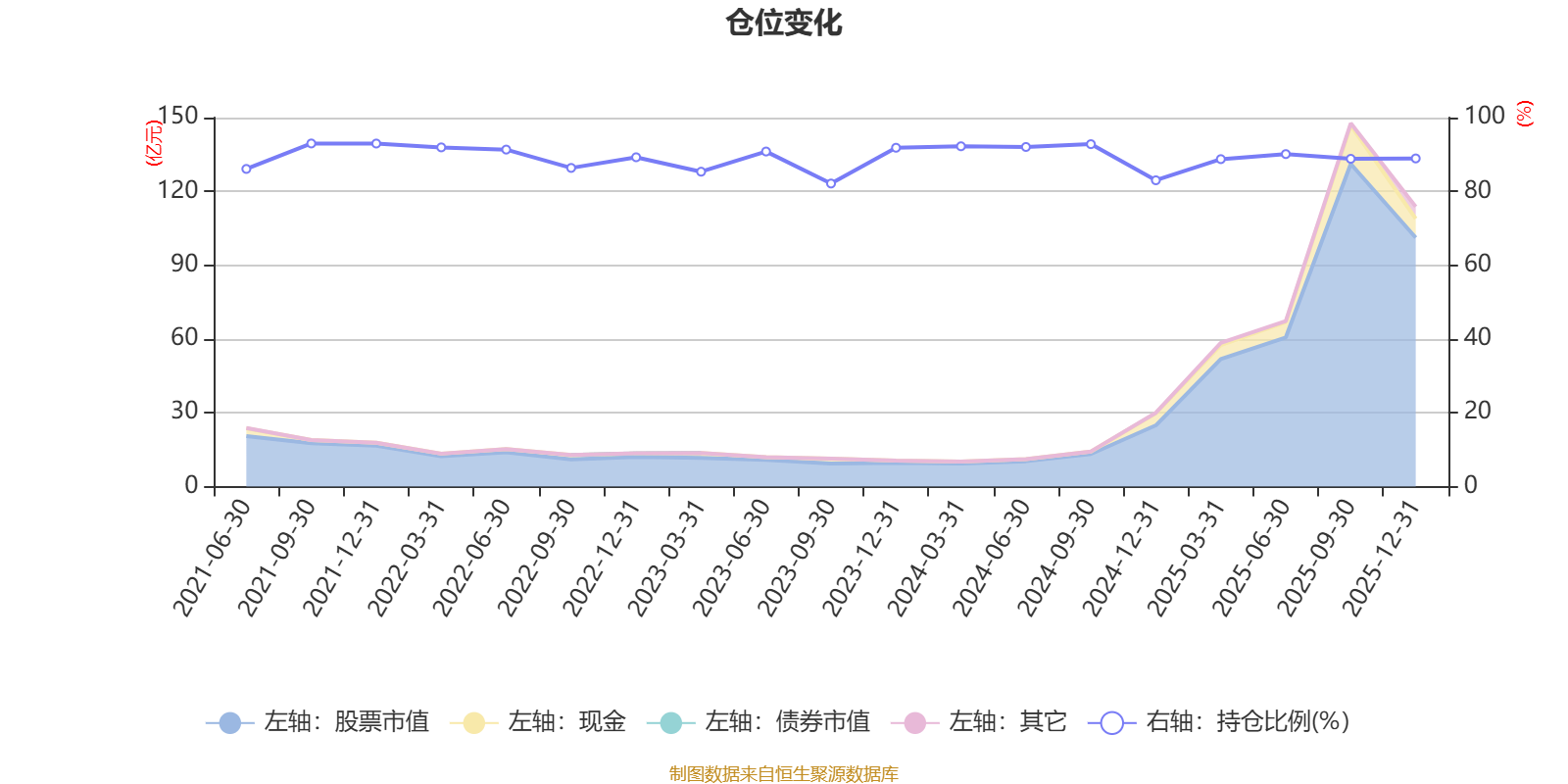 据定期报告数据统计,近三年平均股票仓位为88.9%,同类平均为86.9%。2021年三季度末基金达到92.99%的最高仓位,2023年三季度末最低,为82.13%。