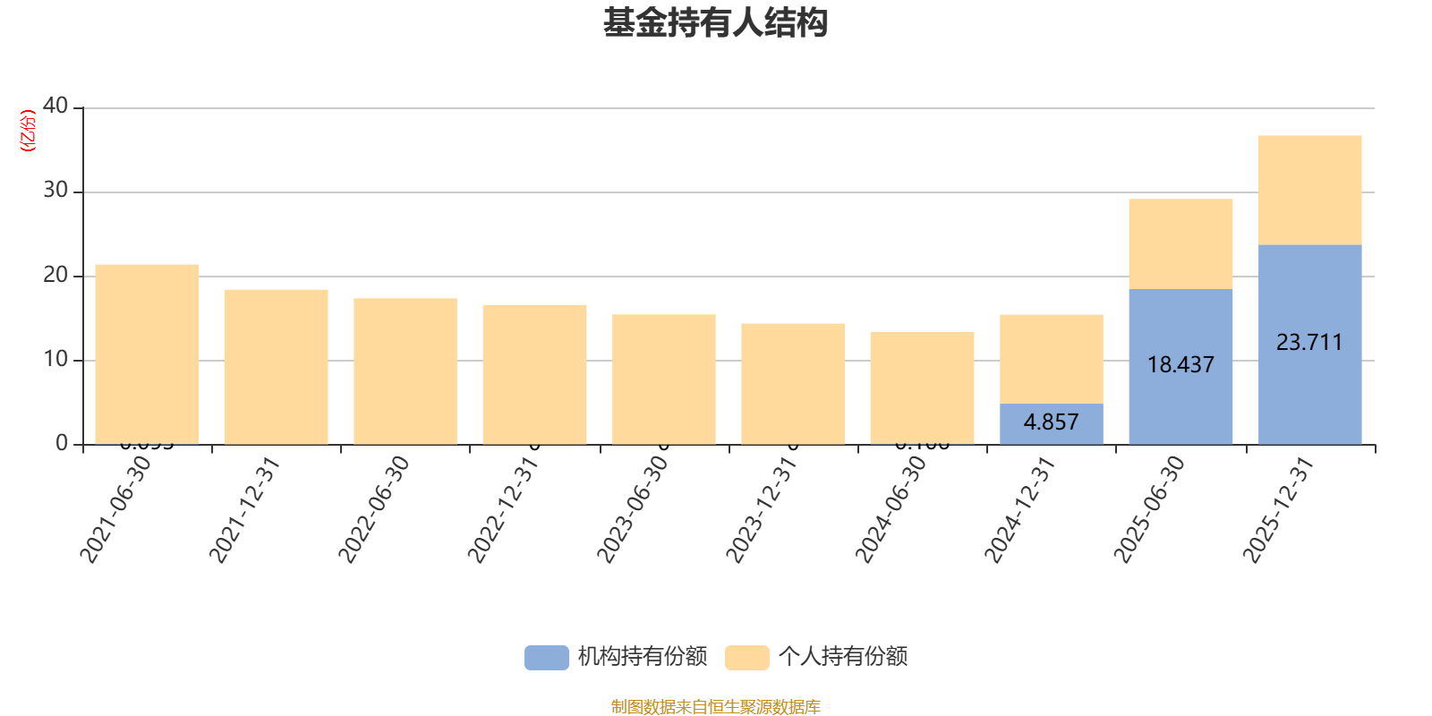 截至2025年12月31日,基金持有人共计6.86万户,合计持有36.66亿份。其中管理人员工持有272.33万份,占比0.07%,机构持有份额占比64.67%,个人投资者占比35.33%。