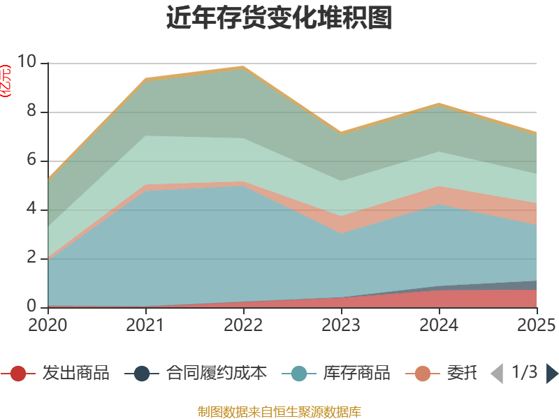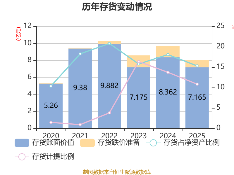 从存货变动来看,截至2025年末,公司存货账面价值为7.16亿元,占净资产的15.3%,较上年末减少1.2亿元。其中,存货跌价准备为8695.68万元,计提比例为10.82%。