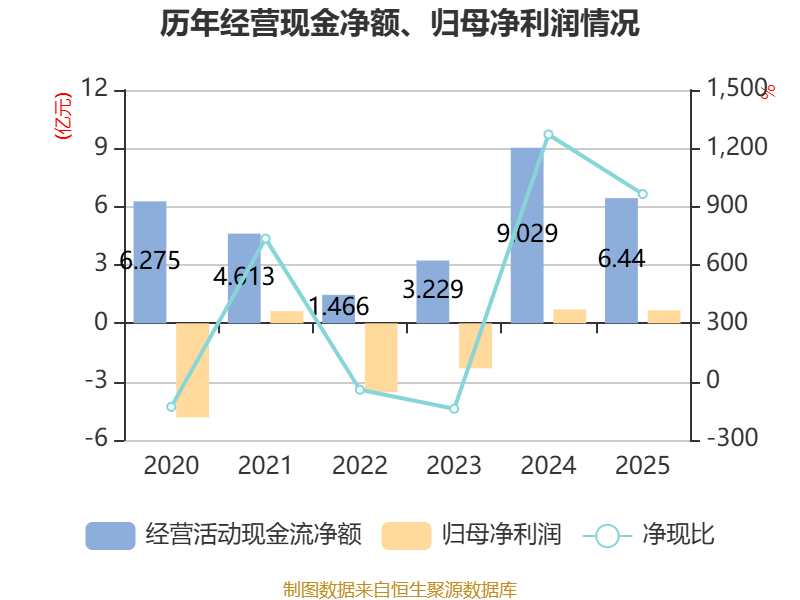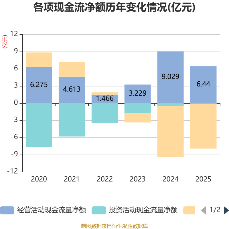截至2025年,公司经营活动现金流净额为6.44亿元,同比下降28.67%;筹资活动现金流净额-7.88亿元,同比增加1.12亿元;投资活动现金流净额-645.74万元,上年同期为-4741.61万元。