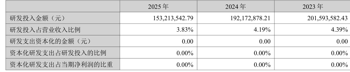 2025年全年,公司研发投入金额为1.53亿元,同比下降20.27%;研发投入占营业收入比例为3.83%,相比上年同期下降0.36个百分点。此外,公司全年研发投入资本化率为0%。