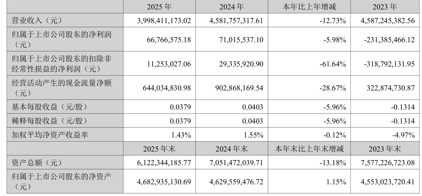 中证智能财讯华峰超纤(300180)4月9日披露2025年年度报告。2025年,公司实现营业总收入39.98亿元,同比下降12.73%;归母净利润6676.66万元,同比下降5.98%;扣非净利润1125.3万元,同比下降61.64%;经营活动产生的现金流量净额为6.44亿元,同比下降28.67%;报告期内,华峰超纤基本每股收益为0.0379元,加权平均净资产收益率为1.43%。公司2025年度分配预案为:拟向全体股东每10股派现0.05元(含税)。