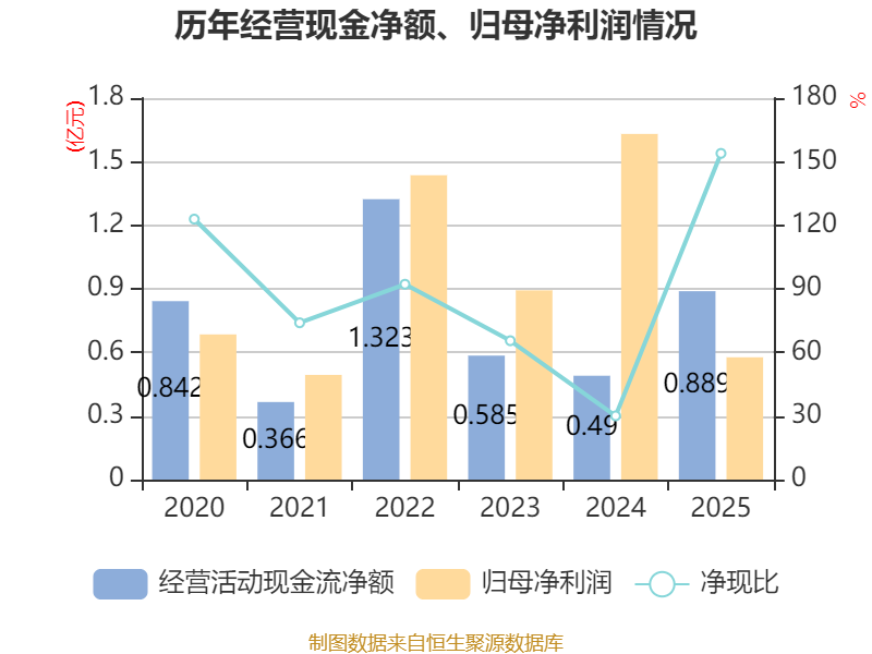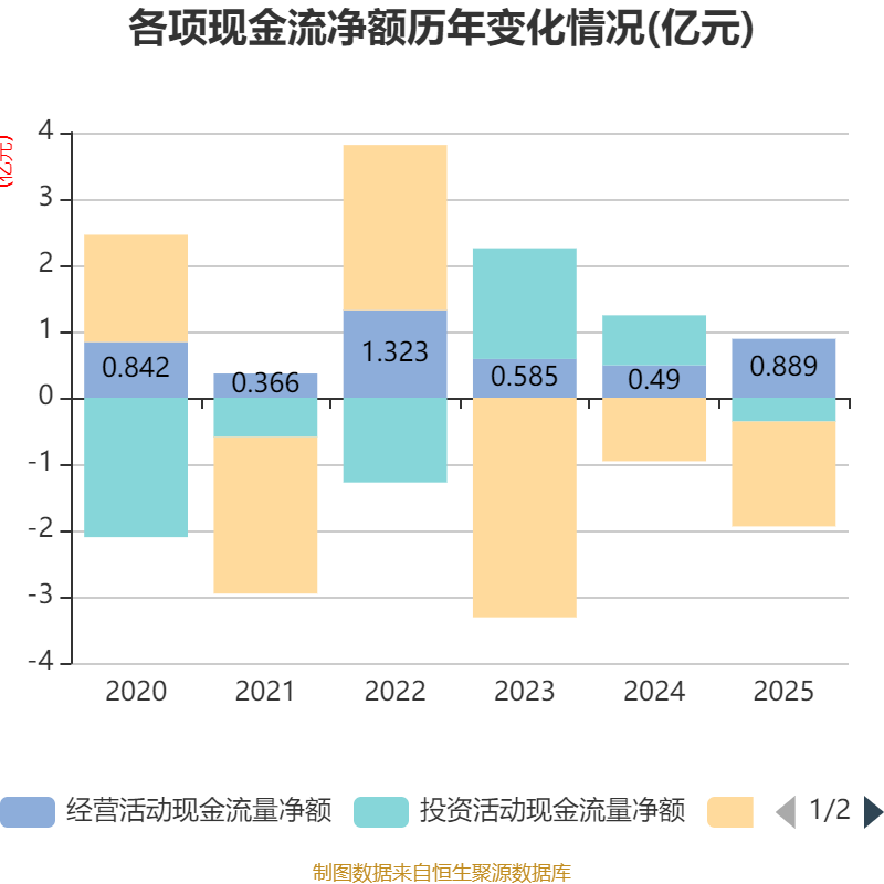 截至2025年,公司经营活动现金流净额为8888.05万元,同比增长81.29%;筹资活动现金流净额-1.58亿元,同比减少6246.32万元;投资活动现金流净额-3577.84万元,上年同期为7536.21万元。